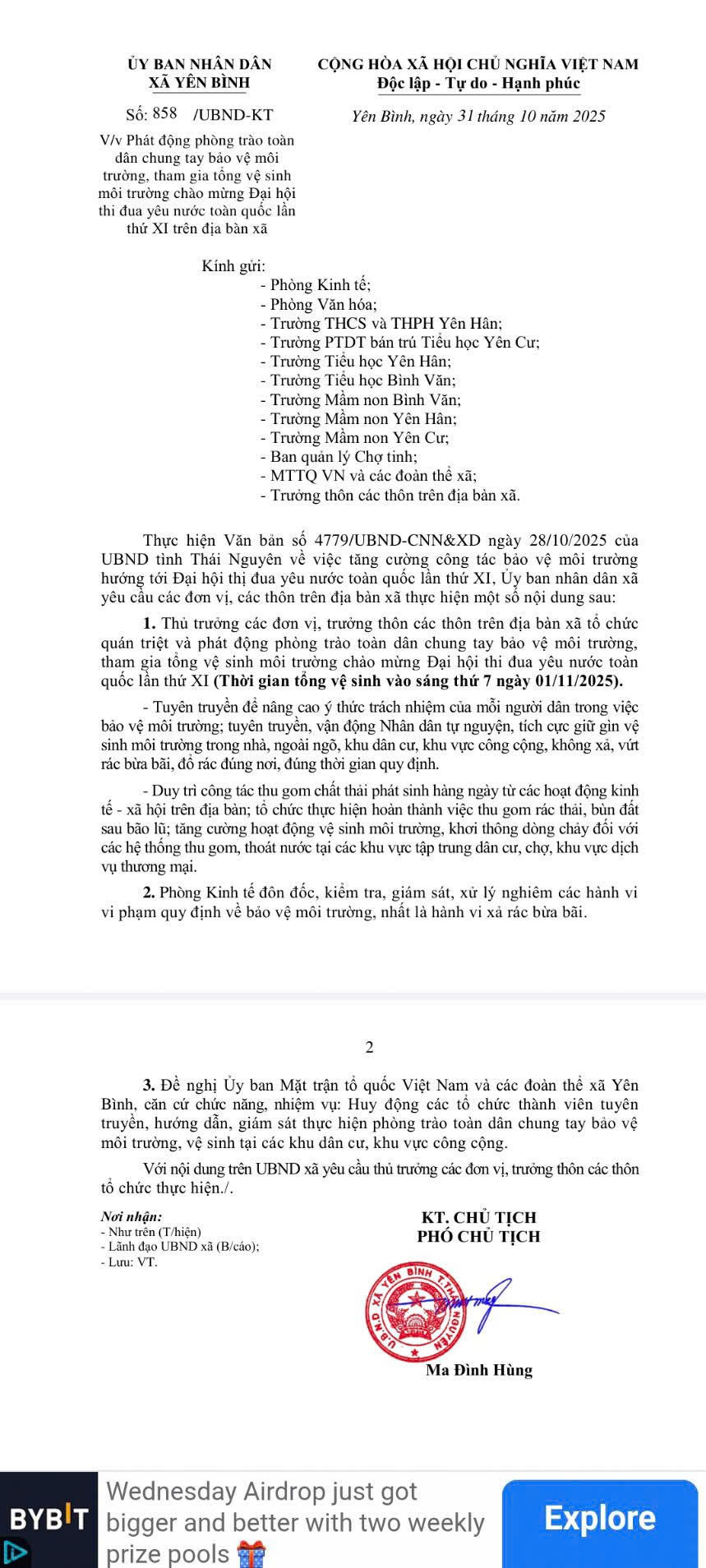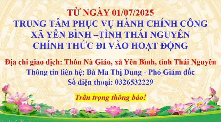 Thực hiện văn bản số 497/UBND-TTPVHCC ngày 19/6/2025 của UBND tỉnh Thái Nguyên về việc triển khai Công điện số 90/CĐ-TTg ngày 17/6/2025 của Thủ tướng Chính phủ về bảo đảm thực hiện thủ tục hành chính (TTHC) thông suốt, hiệu quả, không bị gián đoạn khi sắp xếp đơn vị hành chính và triển khai mô hình chính quyền địa phương 02 cấp. Từ ngày 01 tháng 7 năm 2025, Trung tâm Phục vụ Hành chính công xã Yên Bình chính thức đi vào hoạt động với thông tin cụ thể như sau: