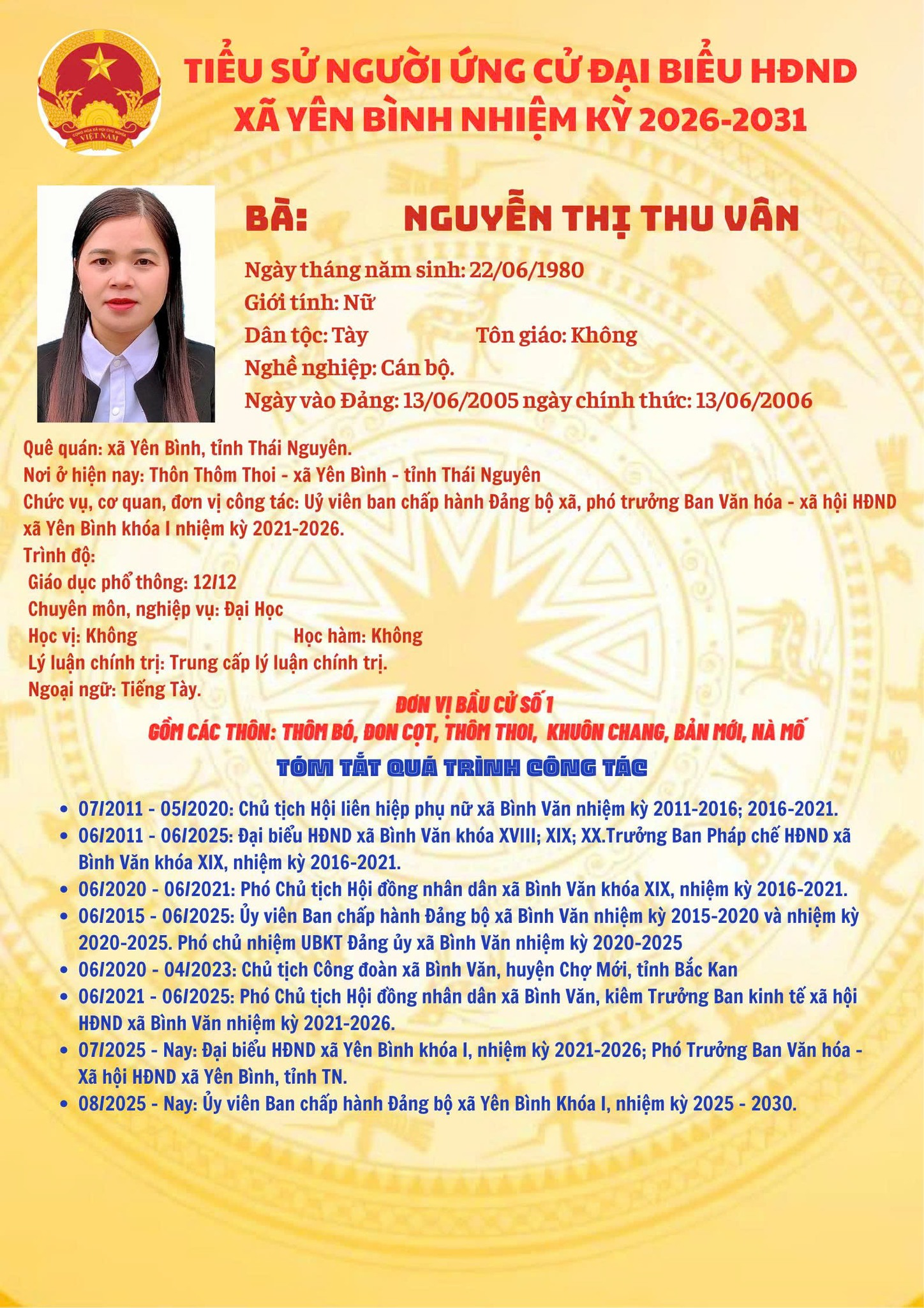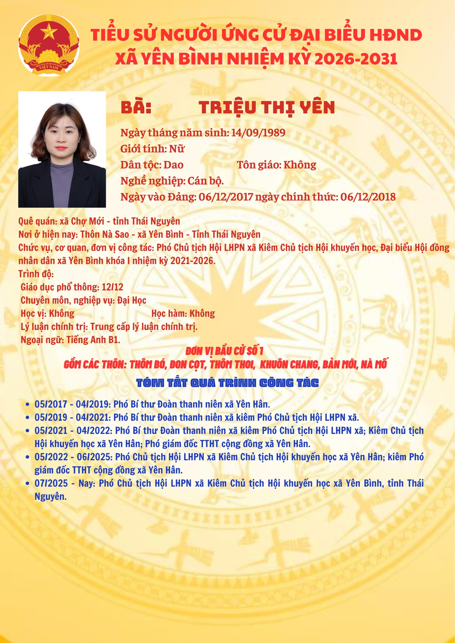 ỦY BAN NHÂN DÂN XÃ YÊN BÌNH TRÂN TRỌNG GIỚI THIỆU TIỂU SỬ TÓM TẮT CÁC ỨNG CỬ VIÊN ĐẠI BIỂU HỘI ĐỒNG NHÂN DÂN XÃ, NHIỆM KỲ 2026 - 2031. Đơn vị bầu cử số 01 gồm các thôn: Thôm Bó, Đon Cọt, Thôm Thoi, Khuôn Chang, Bản Mới, Nà Mố.