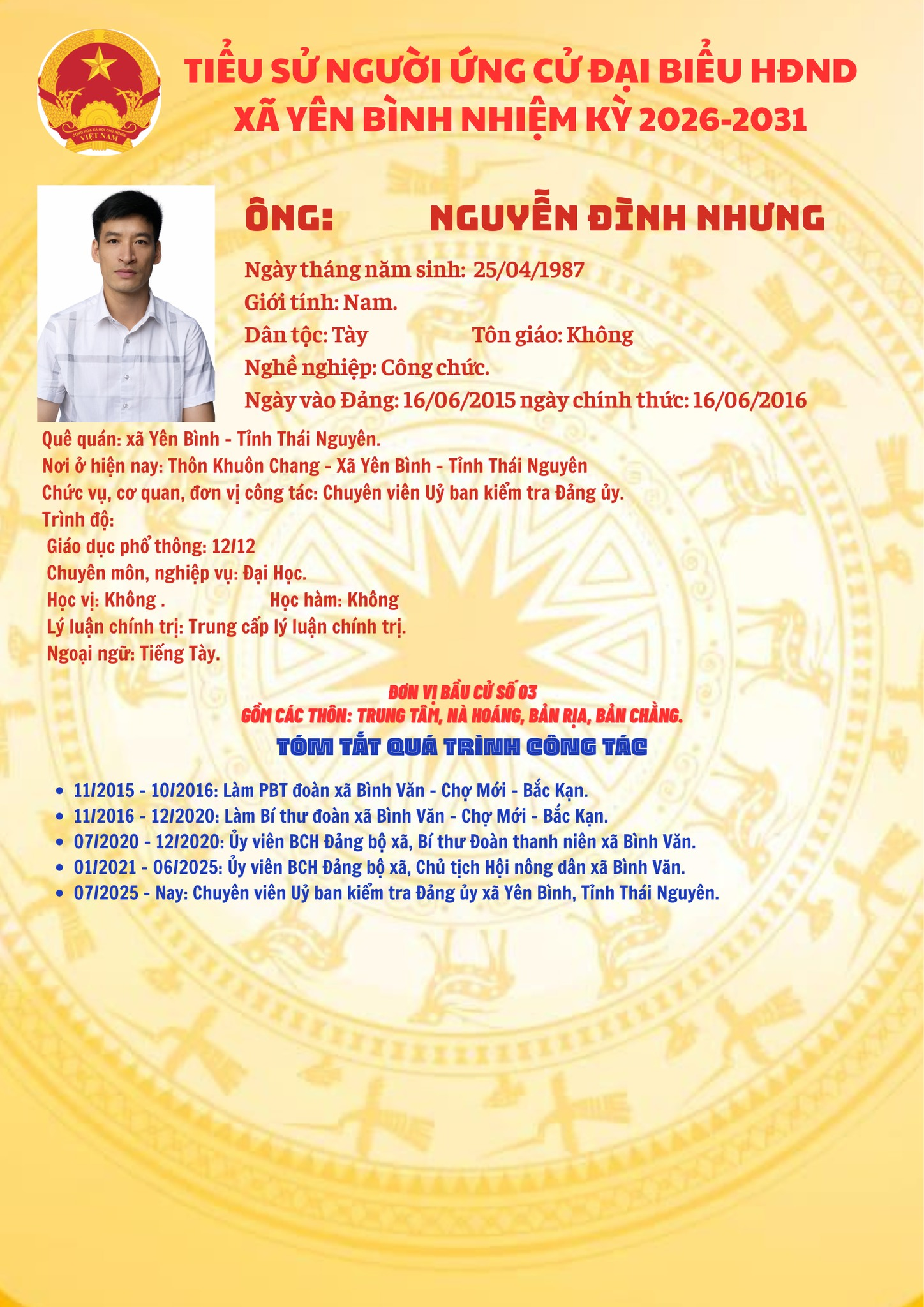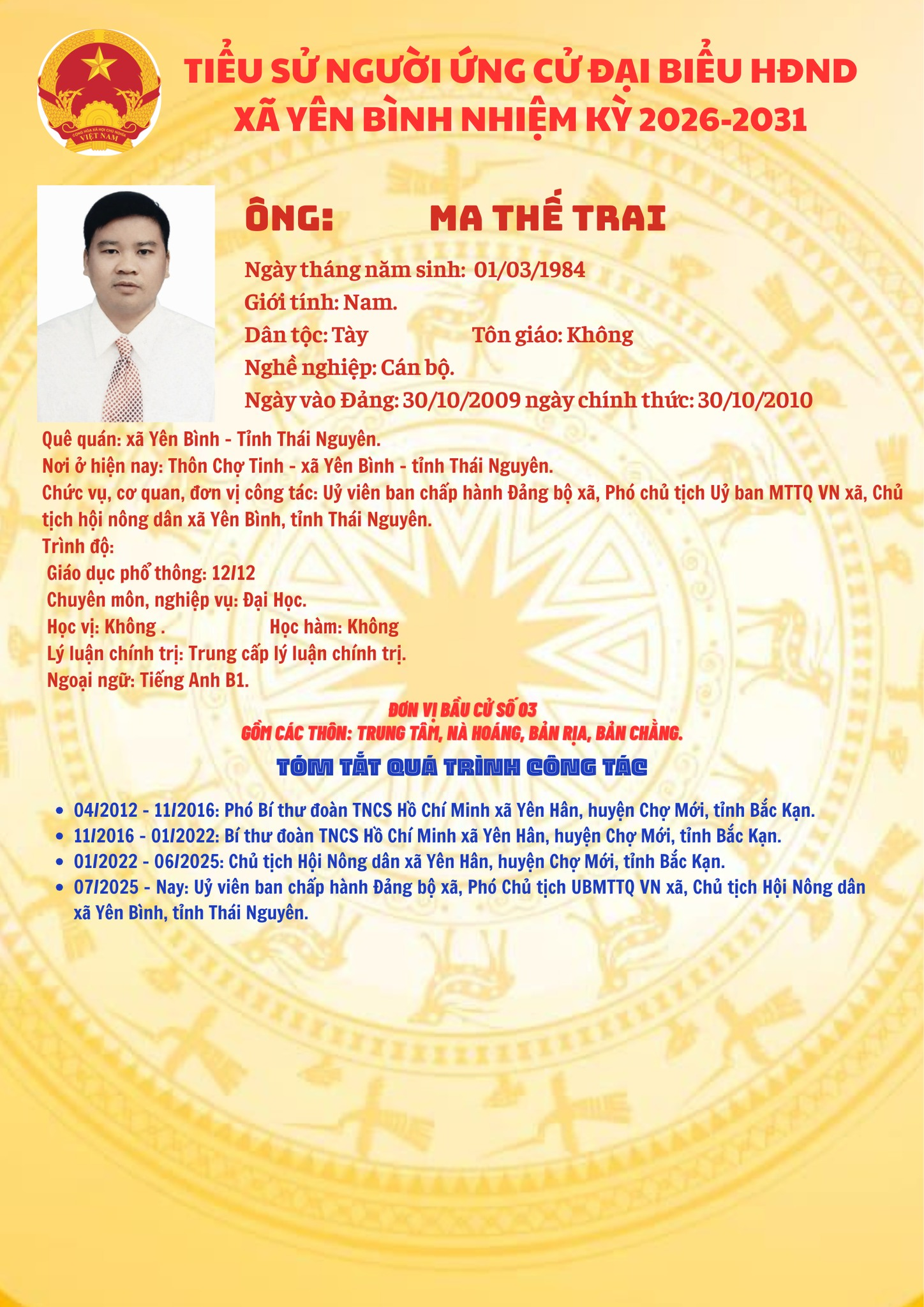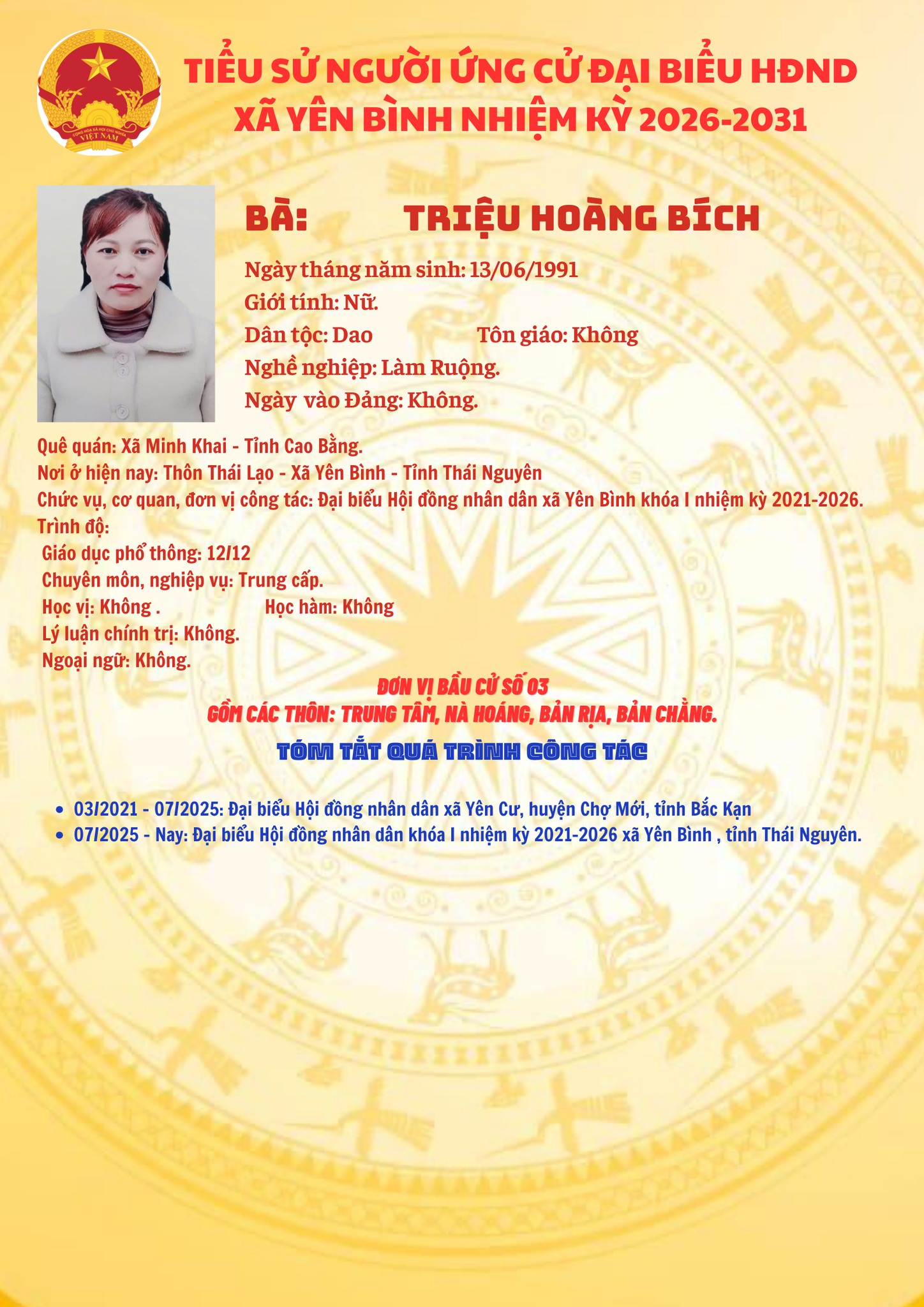 ỦY BAN NHÂN DÂN XÃ YÊN BÌNH TRÂN TRỌNG GIỚI THIỆU TIỂU SỬ TÓM TẮT CÁC ỨNG CỬ VIÊN ĐẠI BIỂU HỘI ĐỒNG NHÂN DÂN XÃ, NHIỆM KỲ 2026 - 2031. Đơn vị bầu cử số 03 gồm các thôn: Trung Tâm, Nà Hoáng, Bản Rịa, Bản Chằng.